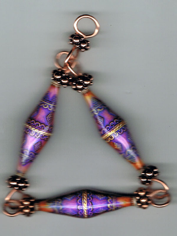 BOUNTIFUL PEACE PENDANT -- $49.95 -- Brings Peace & Harmony to a conflicted atmosphere. This is typically worn into court, debates, political campaigns, possibly peacemaking between tribes, street gangs or squabbling couples. This is a very large pendant, featuring genuine Hedgehog copper beads on heavy gauge copper core wire, with Original color-shifting Steven Sax EMO beads in a floral pattern suggested by an ancient vase design.