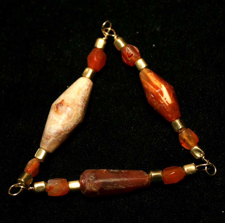 Solid gold wire and hammered gold beads adorn this ancient Workshop of Klymnos Carved Carnelian Triad -- the second was not found.