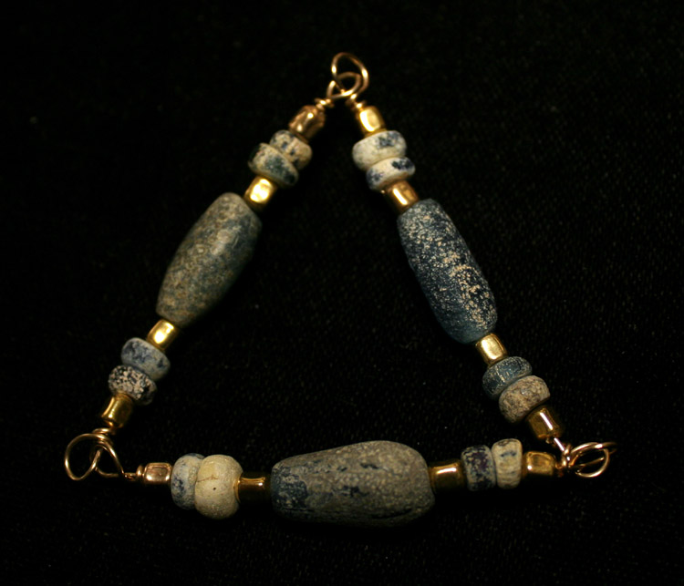 This reconstructed Triad features Ancient Cobalt Glass & solid Electrum Gold Beads. Electrum is a natural amalgam of gold with some silver, in this case about .850 fine.
