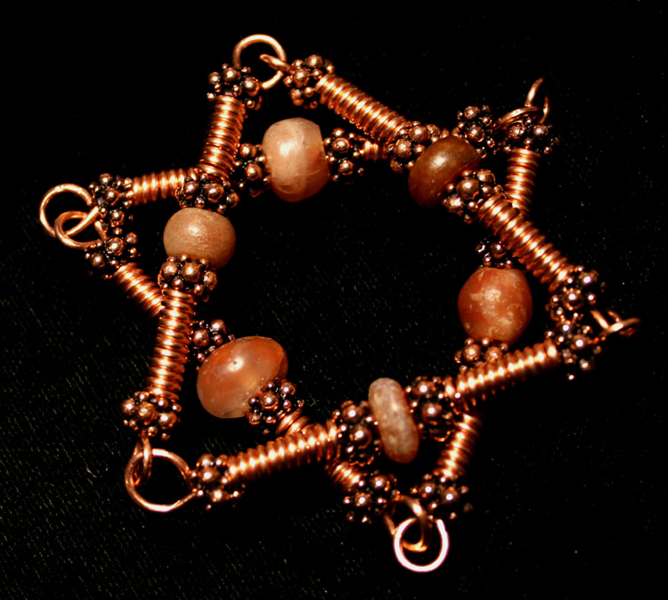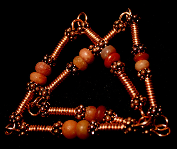 Double Carnelian Rebuild of a Tesla Style Triad, with ancient Near-Eastern Carnelian beads dated about 1200 B.C., made with modern copper findings & wire.