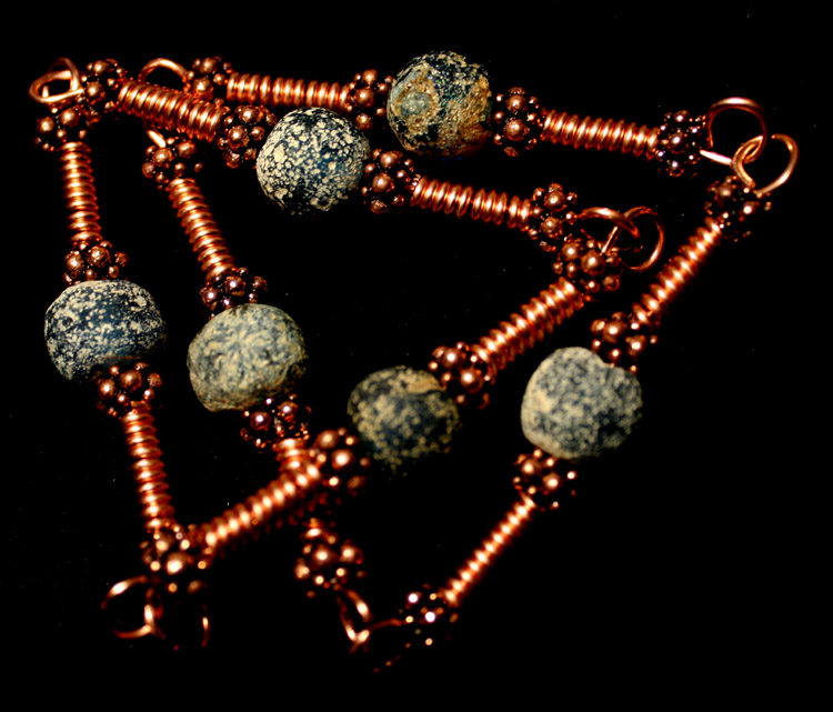 Ancient Milk Glass Primaries and Cobalt Glass Tubes dated about 100 A.D., reconstructed with modern copper findings & wire.