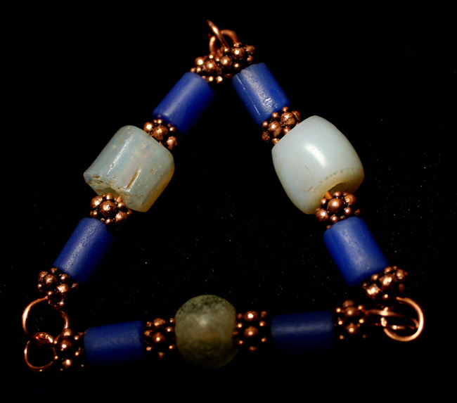Rebuilt of an ancient Cobalt Glass Triad Set with ancient glass beads dated about 100 B.C. – 100 A.D. with modern copper findings & wire.
