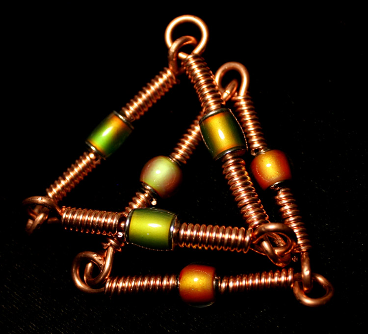 The CLASSIC Triad is made with Normal Blue Mermaid EMO color-changing beads for the focus points, Floral EMO Tubes and solid handmade pure copper HEDGEHOG beads, formed on a solid .16 gauge pure copper CORE wire, joined at the corners to form a powerful triangular focusing device used by the ancients in almost every early civilization.